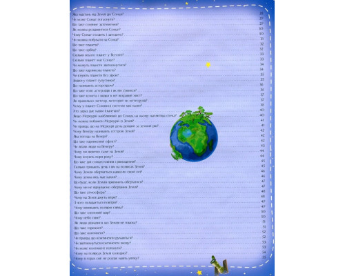 КольоровіВидання у доступній формі розповідає про складні й надзвичайно цікаві явища, пов'язані із Землею і таємницями космосу. Невгамовні чомучки дізнаються, як і чому у безмежному просторі Всесвіту з'явилися Сонце і Місяць, як космічні сусіди нашої блакитної планети впливають на життя людей, як працюють космічні апарати та чи варто найближчим часом чекати на прибуття інопланетян.